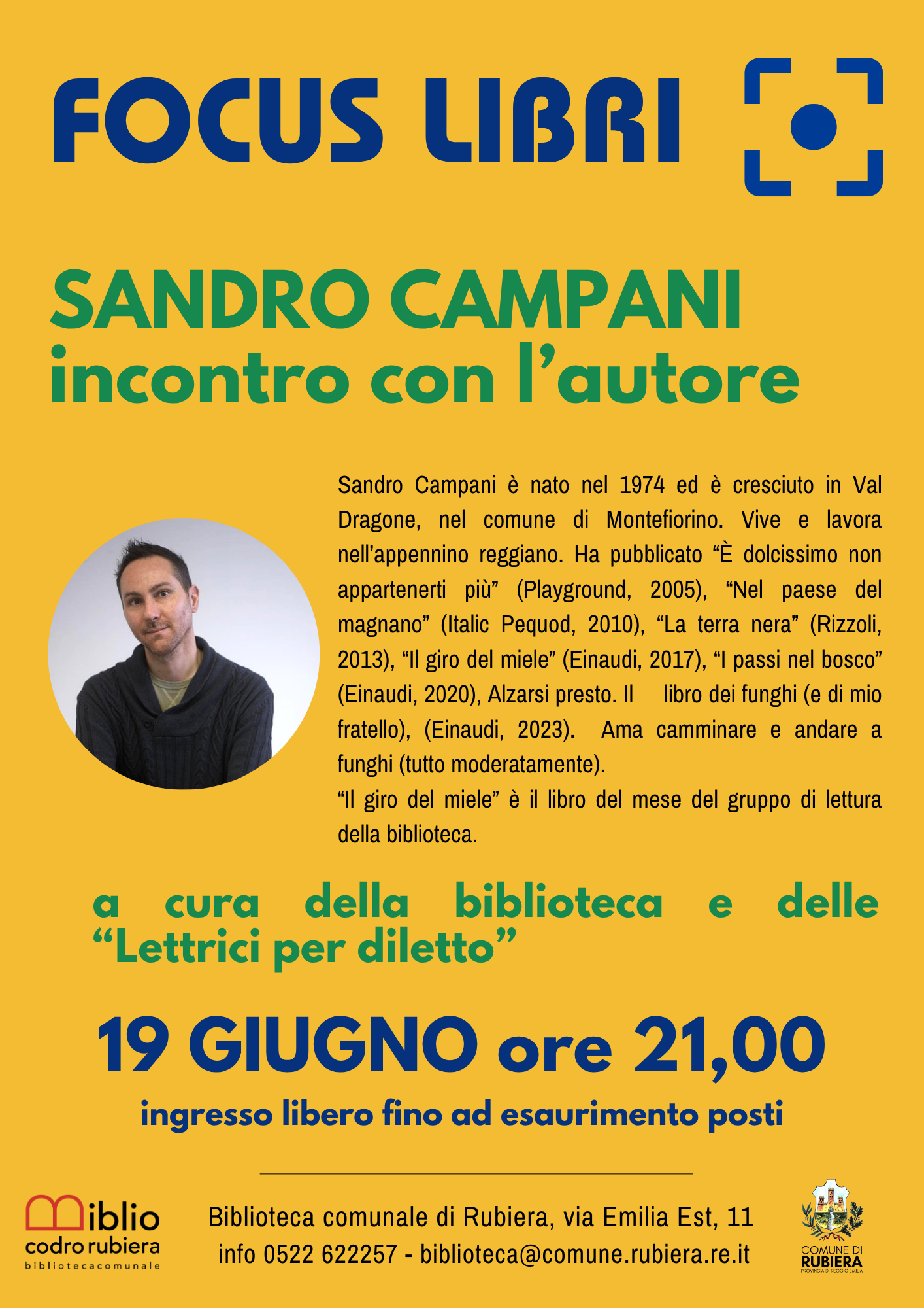 Giovedi 19 giugno, alle ore 21:00, ospiteremo Sandro Campani, scrittore originario della Val Dragone (Appennino reggiano), che nel corso della serata dialogherà con il pubblico raccontando il suo percorso narrativo, il legame con la sua terra e le vicende che ispirano i suoi romanzi.