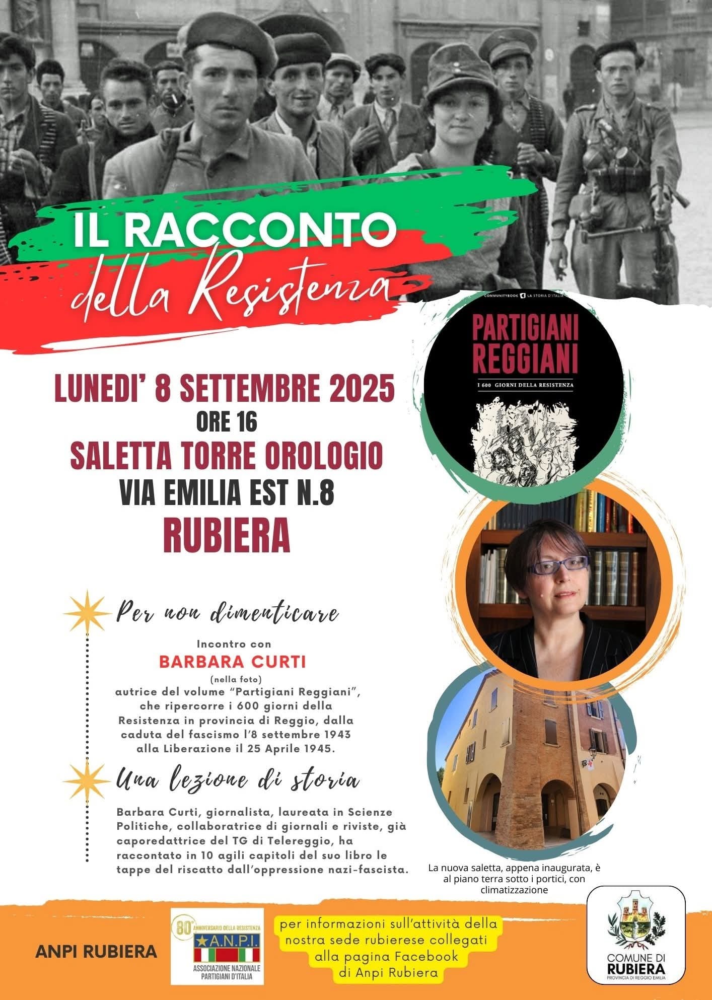 Lunedì 8 settembre, alle 16, nella saletta della Torre dell'Orologio, in Via Emilia Est n 8, avrà luogo l'incontro "Il racconto della Resistenza" con Barbara Curti, autrice del volume "Partigiani Reggiani".
