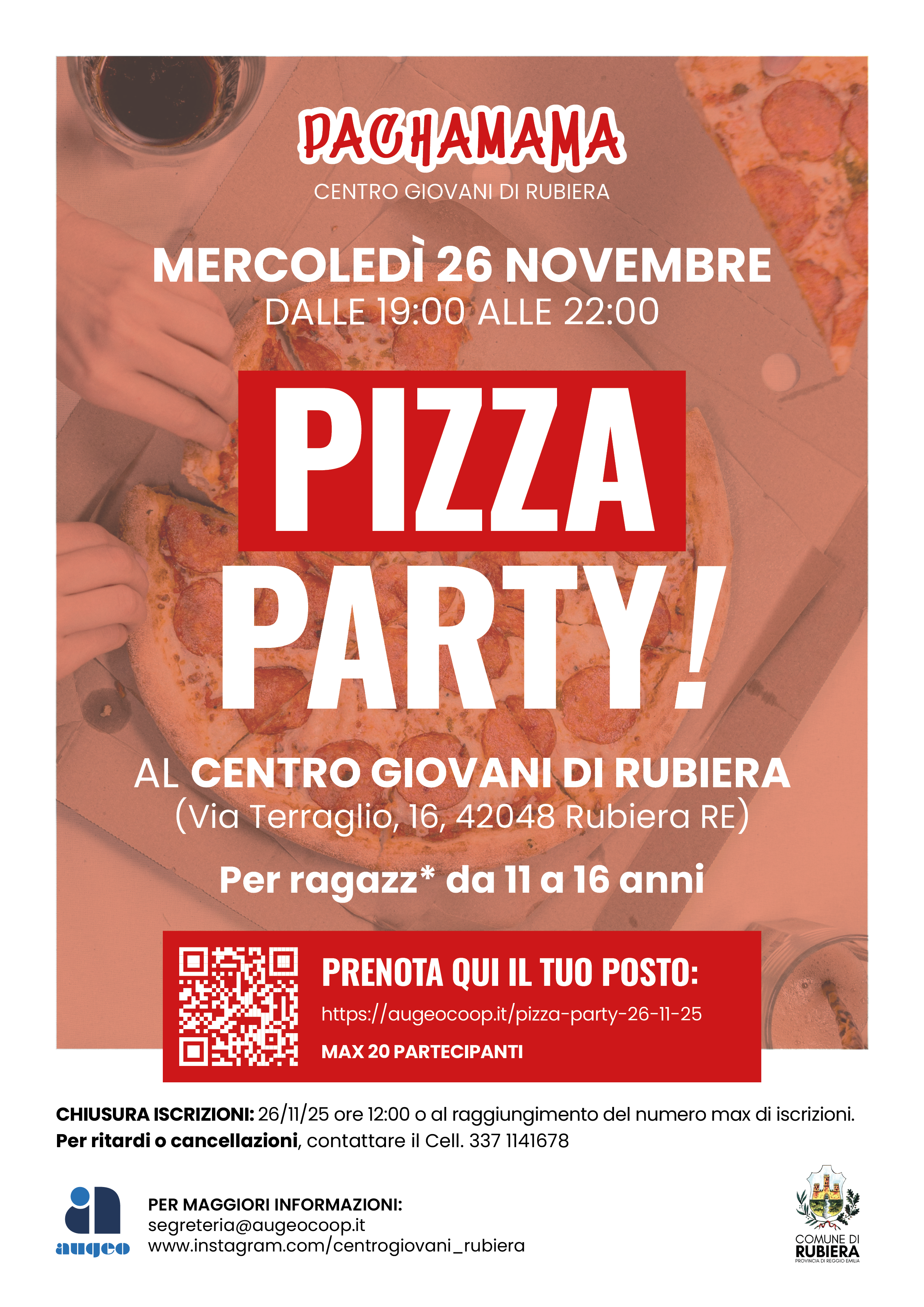 Iscrizione obbligatoria – massimo 20 partecipanti all'indirizzo https://augeocoop.it/pizza-party-26-11-25/