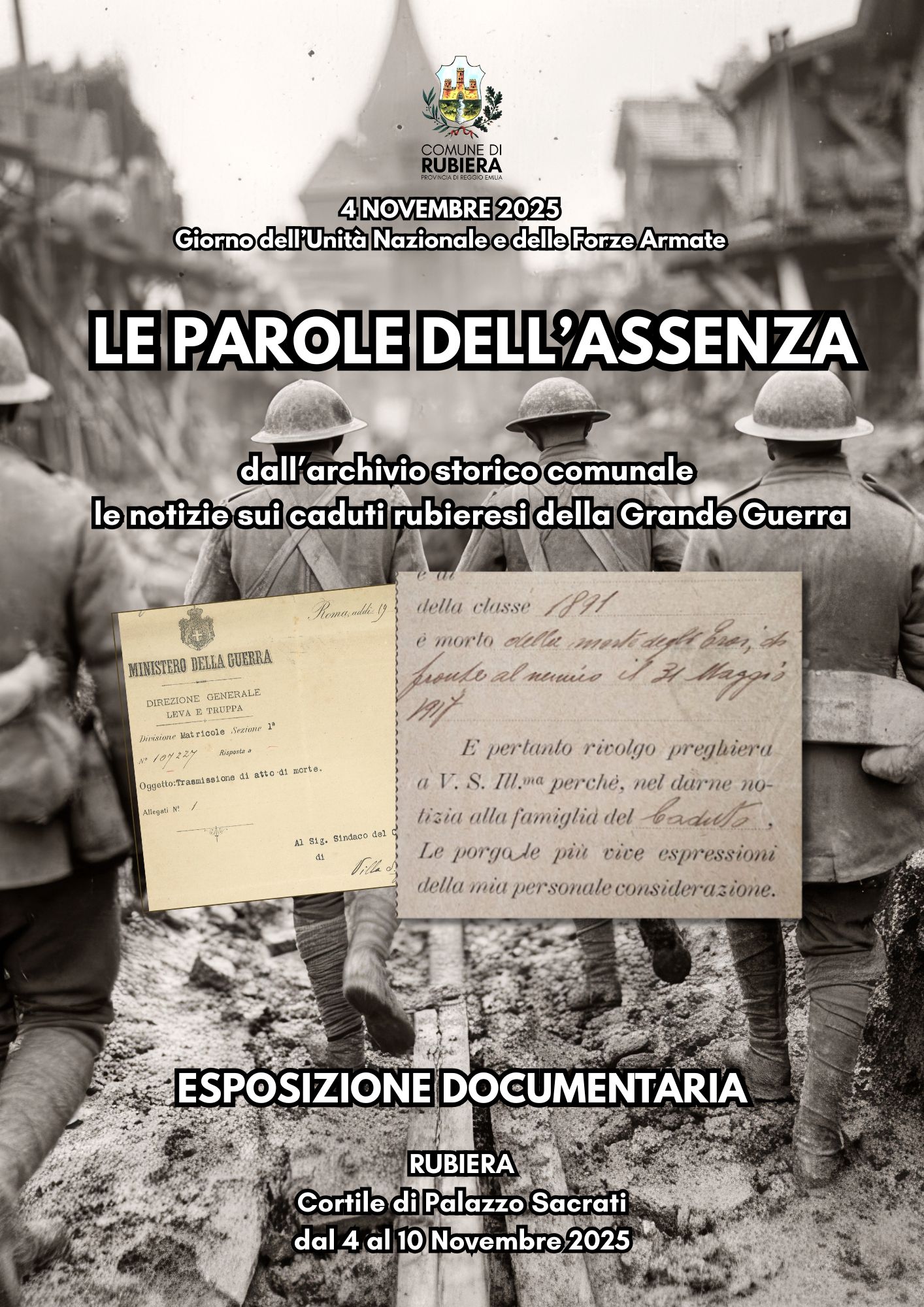 Dal 4 al 10 novembre, nel Cortile di Palazzo Sacrati, è visitabile l'esposizione documentaria "Le parole dell'assenza" : verranno esposte le tristi comunicazioni che negli anni della Grande Guerra arrivavano al Comune a seguito del decesso al fronte di un cittadino rubierese. A seguito di un decesso infatti, il comando scriveva al sindaco, che provvedeva poi ad informare i famigliari.