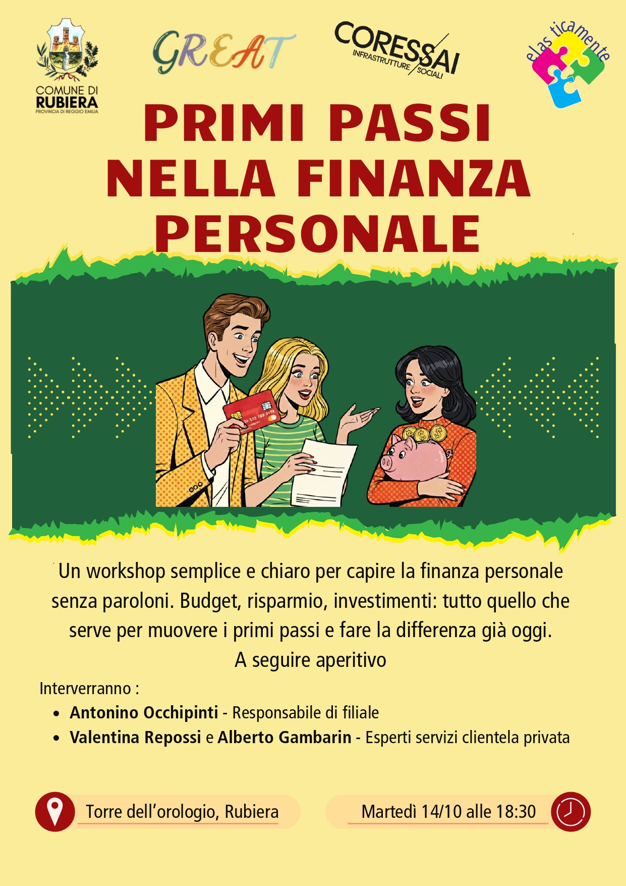 Martedì 14 ottobre alle 18.30 , presso il nuovo Centro Giovani al piano terra della Torre dell'Orologio vi aspettiamo per un workshop relativo alla finanza personale accompagnati da alcuni esperti del settore.