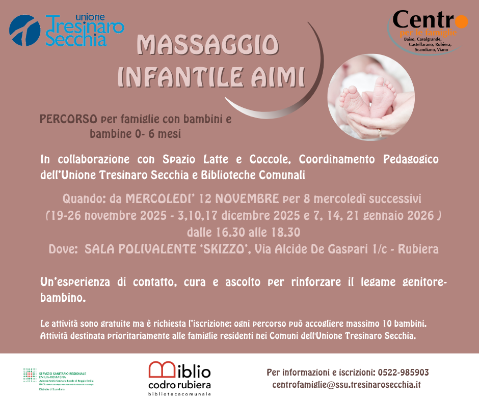 Nove incontri  a partire da mercoledì 12 novembre – e per gli 8 mercoledì successivi - dalle 16:30 alle 18:30 alla sala 'Skizzo' di Rubiera in via Alcide De Gasperi 1/b dedicati alla pratica del massaggio infantile secondo il metodo Aimi (Associazione italiana massaggio infantile) e al sostegno alla genitorialità, con momenti di confronto e condivisione tra genitori