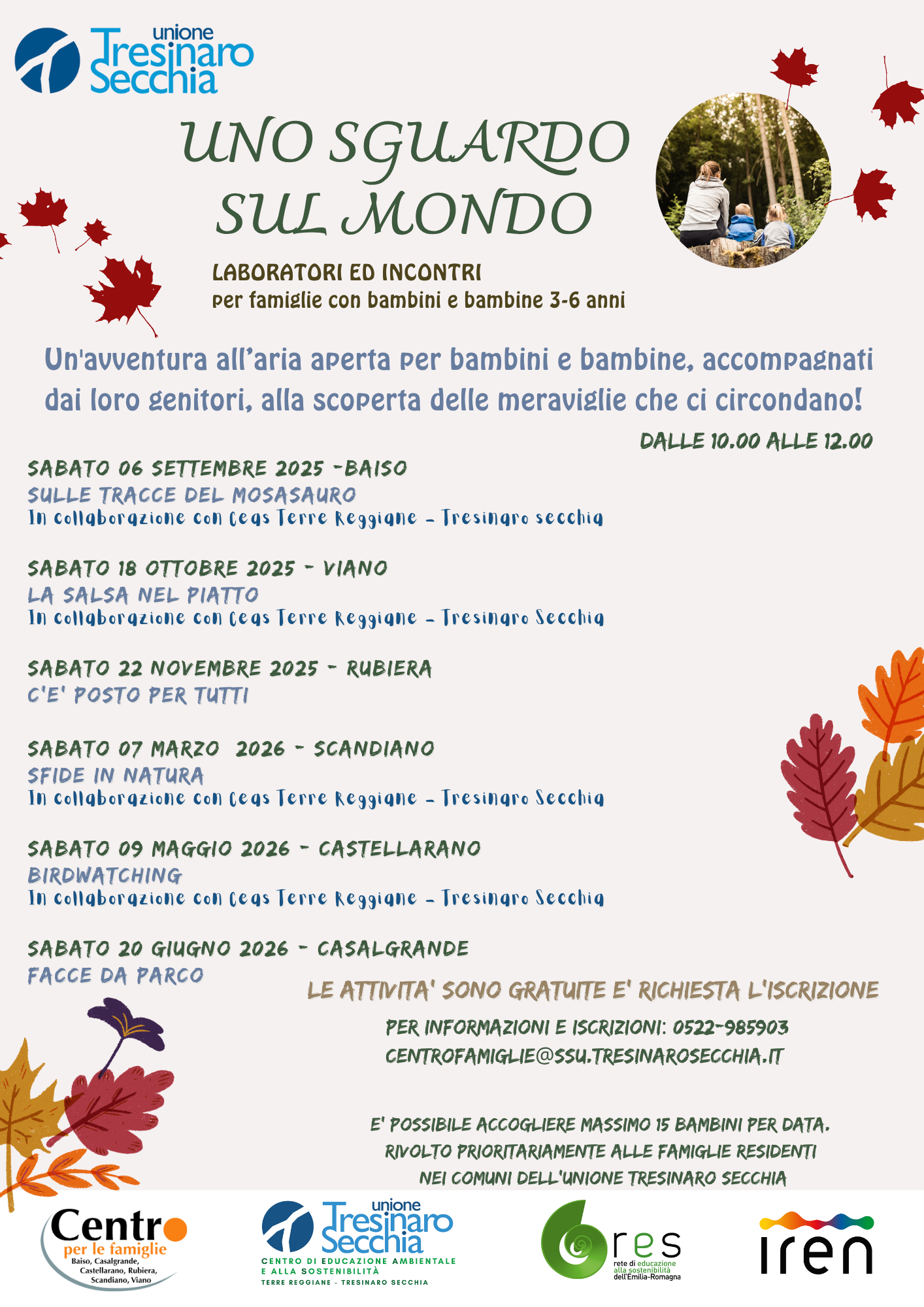 Dal 6 settembre inizierà il ciclo autunnale di “Uno sguardo sul mondo”, avventure all'aria aperta per bambine e bambini dai 3 ai 6 anni, accompagnati dai loro genitori, alla scoperta delle meraviglie che ci circondano. Comune Baiso, Comune di Viano e Comune di Rubiera i comuni interessati fino a novembre, a cui si aggiungeranno – da marzo a giugno – Comune di Scandiano, Il cuore di Castellarano e Comune di Casalgrande.