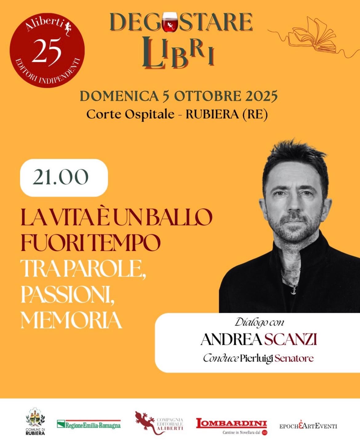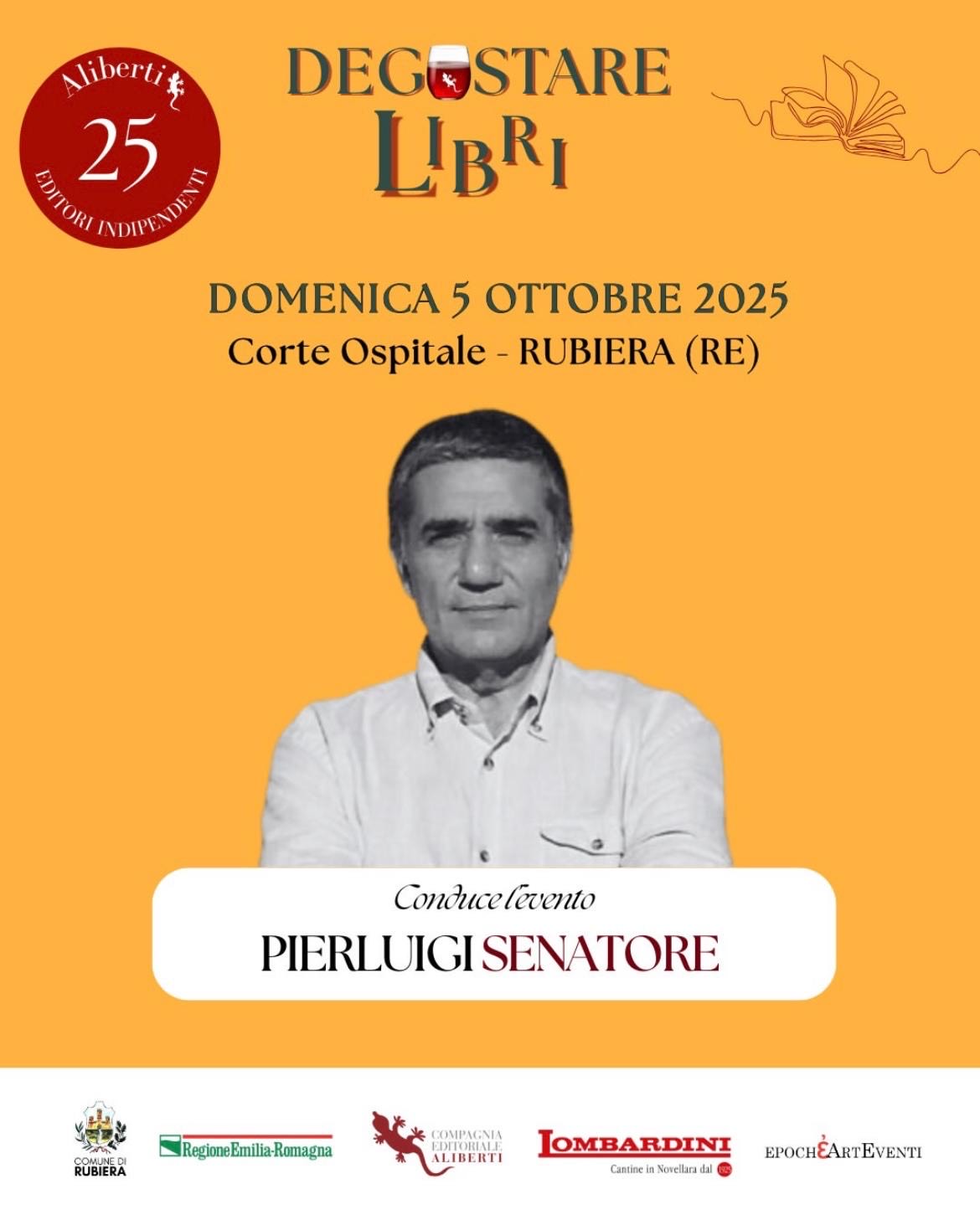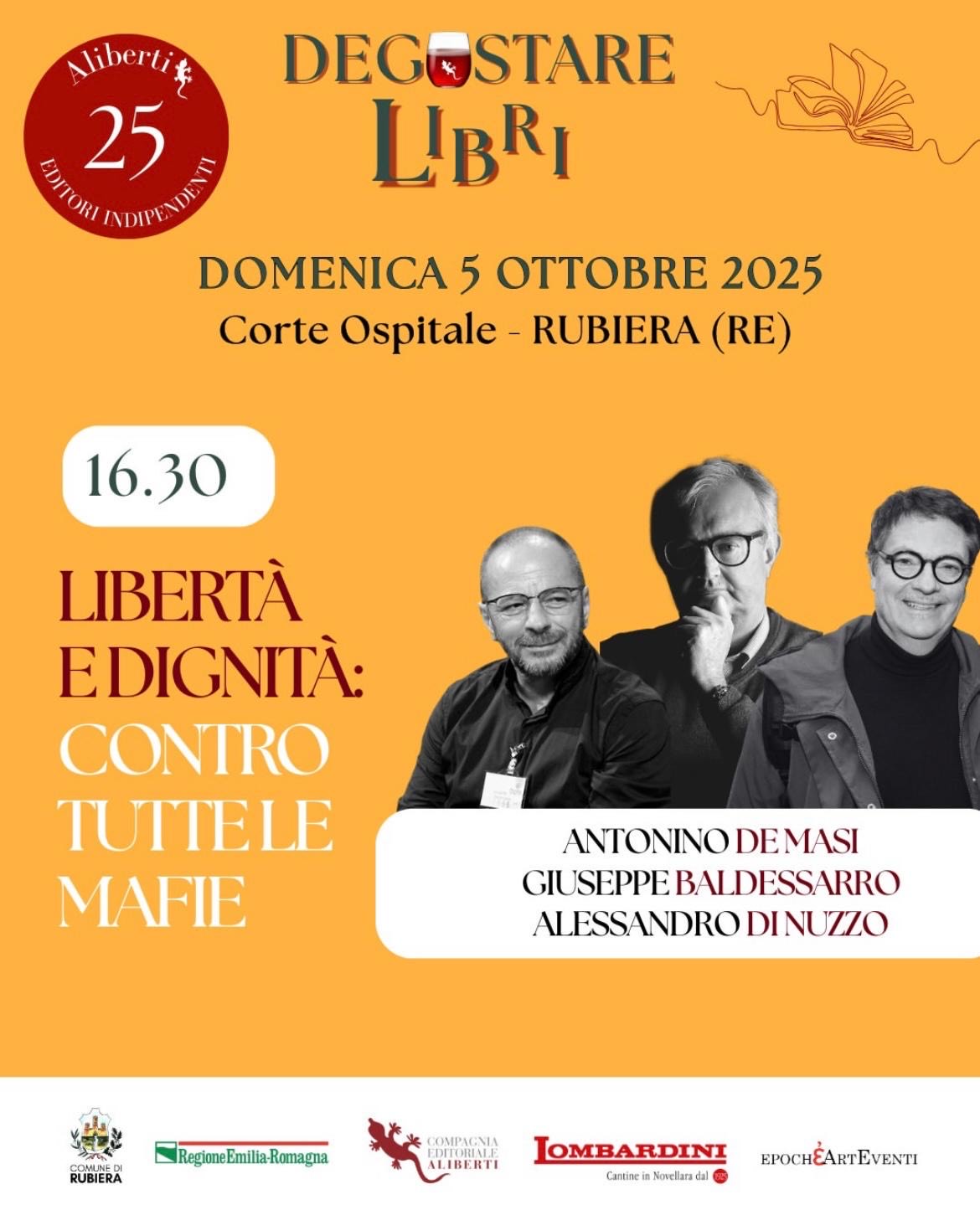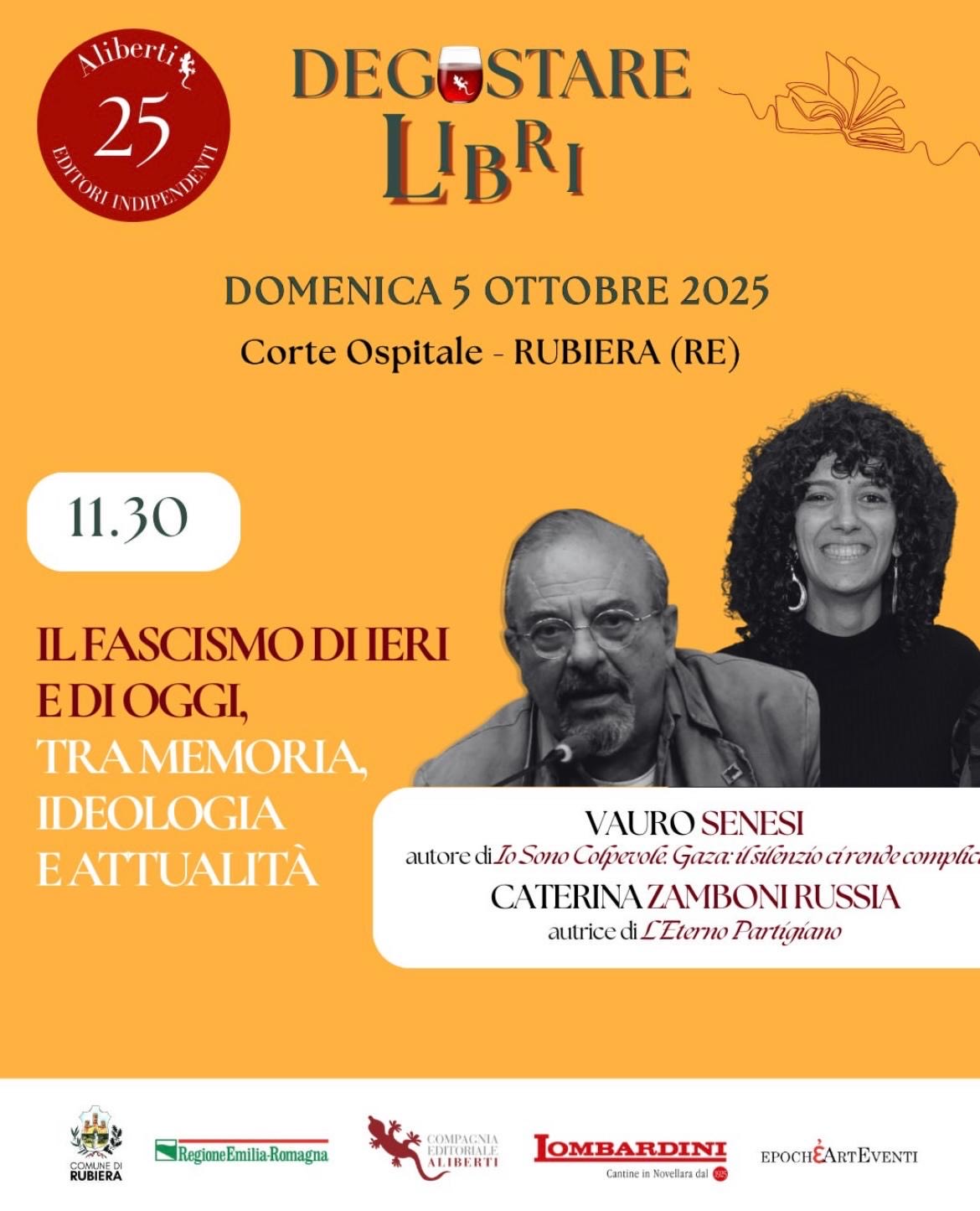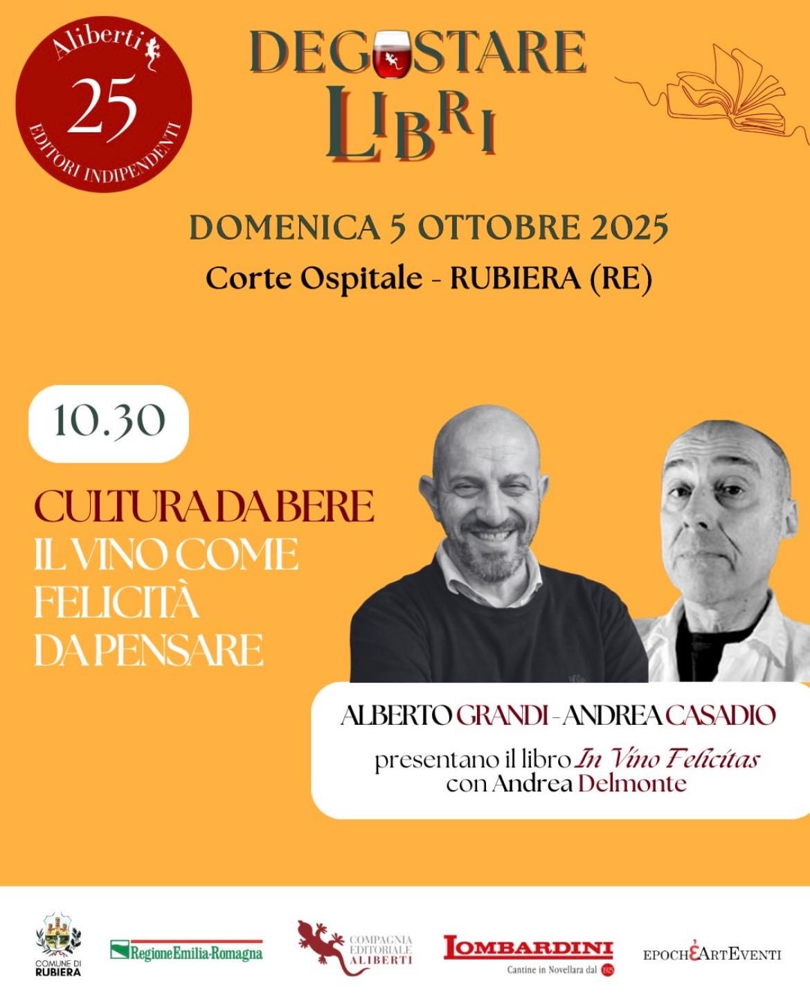 Domenica 5 ottobre la Corte Ospitale di Rubiera ospita il festival che celebra i 25 anni della Compagnia editrice Aliberti e alterna dibattiti, presentazioni di libri, conferenze a degustazioni di vini delle Cantine Lombardini di Novellara.