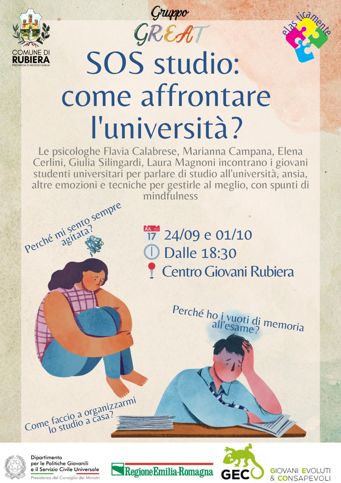 Mercoledì 24 settembre e mercoledì 1° ottobre dalle 18.30, il gruppo GREAT organizza presso il Centro giovani (parco Don Andreoli) un incontro tra le psicologhe Flavia Calabrese, Marianna Campana, Elena Cerlini, Giulia Silingardi e Laura Magnoni ei giovani studenti universitari per parlare di studio all'università, ansia, altre emozioni e tecniche per gestirle al meglio, con spunti di mindfulness