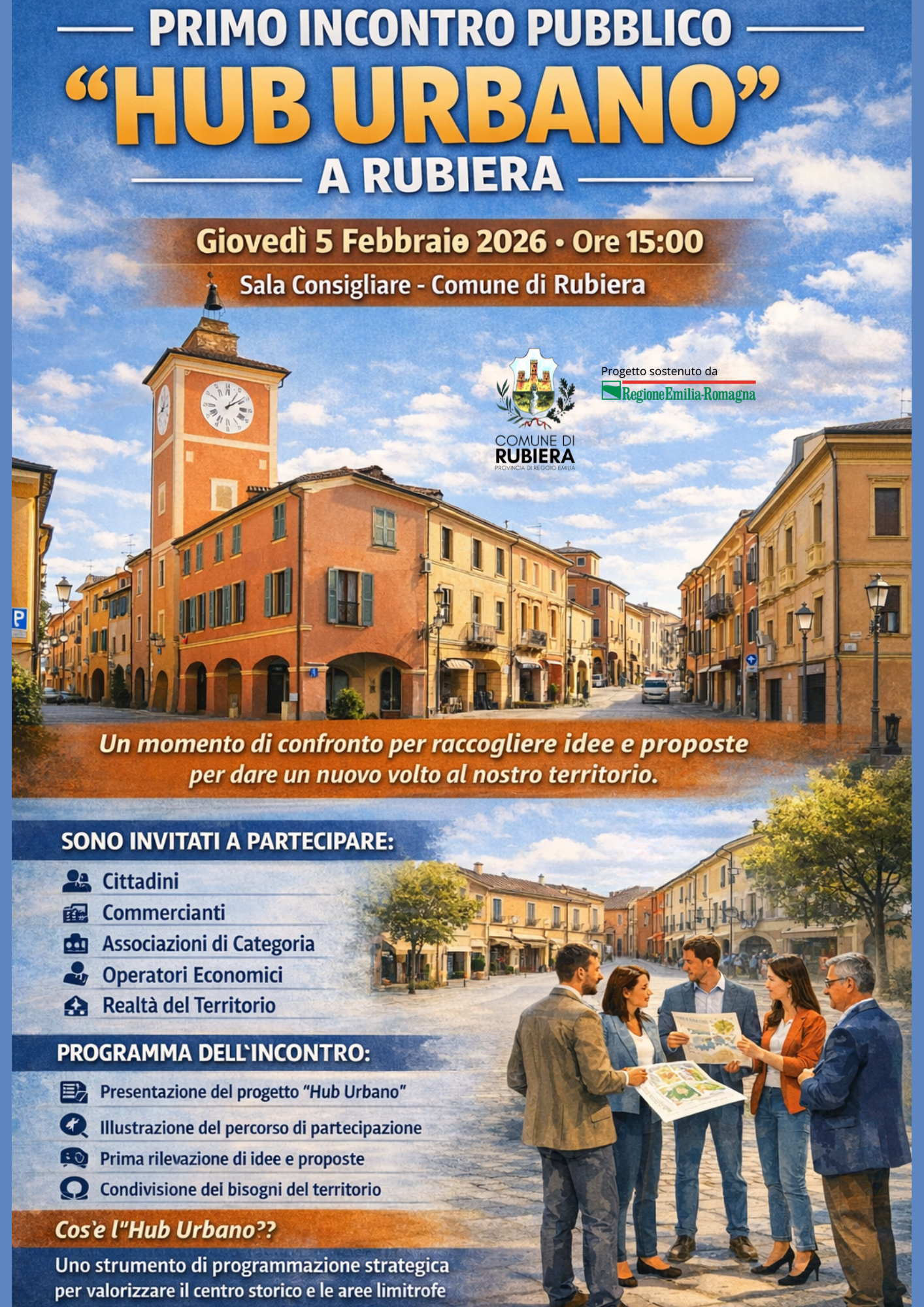 Sono invitati i commercianti, le associazioni di categoria, gli operatori economici, le associazioni del territorio e i cittadini che hanno progetti e/o iniziative da proporre per condividere una rappresentazione reale delle esigenze del territorio. Durante l'incontro verrà illustrato il percorso che porterà alla presentazione dello studio di fattibilità dell’Hub urbano di Rubiera e verrà effettuata una prima rilevazione per una raccolta delle proposte dei presenti.