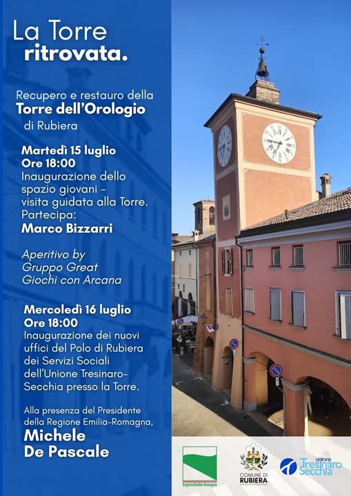 Martedì 15 e mercoledì 16 luglio sono state due giornate speciali per celebrare insieme la rinascita di uno dei simboli più amati di Rubiera e del suo Centro Storico, la 𝗧𝗼𝗿𝗿𝗲 𝗱𝗲𝗹𝗹’𝗢𝗿𝗼𝗹𝗼𝗴𝗶𝗼, restituita alla comunità dopo un importante intervento Le inaugurazioni hanno dato vita vita a due nuovi spazi per la collettività e hanno visto la partecipazione di due ospiti d’eccezione, il nostro concittadino 𝗠𝗮𝗿𝗰𝗼 𝗕𝗶𝘇𝘇𝗮𝗿𝗿𝗶 e il Presidente della Regione Emilia Romagna 𝗠𝗶𝗰𝗵𝗲𝗹𝗲 𝗗𝗲 𝗣𝗮𝘀𝗰𝗮𝗹𝗲.