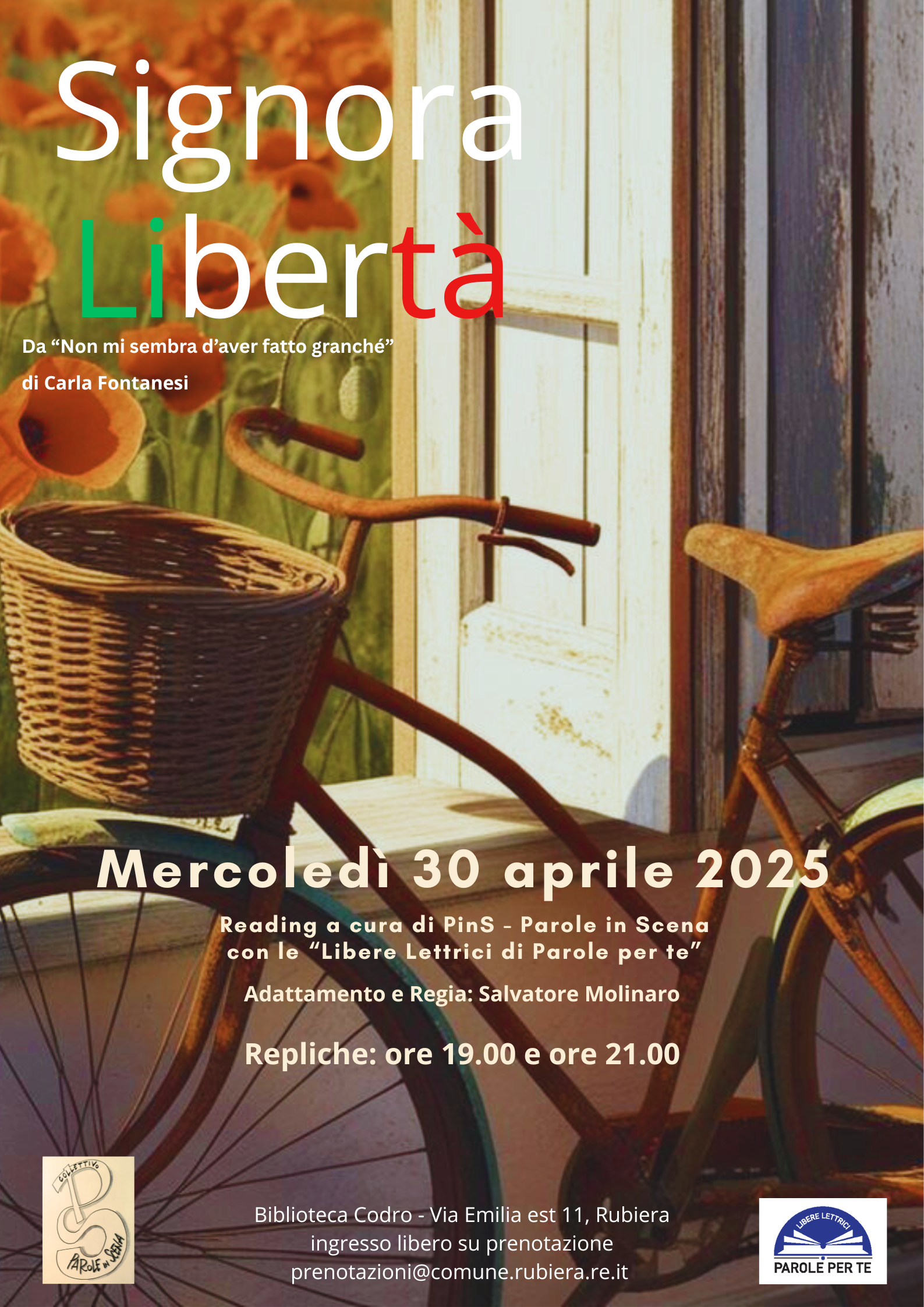 Dalle pagine di “Non mi sembra di aver fatto granché” di Carla Fontanesi, un viaggio emozionante nel cuore delle Resistenza di Scandiano, vista attraverso gli occhi, le voci, le azioni di donne straordinarie, donne comuni, madri, figlie, sorelle, amiche che, di fronte all'orrore della guerra e dell'occupazione nazifascista, non si sono voltate dall’altra parte ma hanno saputo trovare dentro di sé una forza inaspettata. Le loro case diventano rifugi per disertori, le loro mani curano i feriti, le loro gambe pedalano più veloce che possono per consegnare messaggi ai partigiani, le loro voci gridano speranza e cambiamento. Signora Libertà, un reading a quattro voci, è l’omaggio a queste donne che hanno saputo trasformare la paura in determinazione, la privazione in solidarietà, il silenzio in azione, perché la Libertà “così preziosa come il vino, così gratis come la tristezza” è una conquista da difendere ogni giorno.
