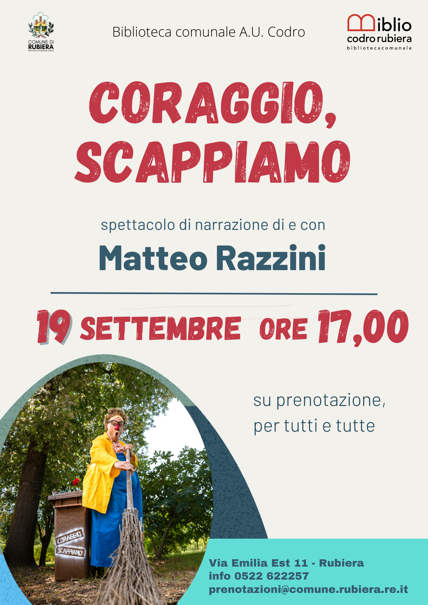 "Coraggio scappiamo" è uno spettacolo di narrazione di e con Matteo Razzini.