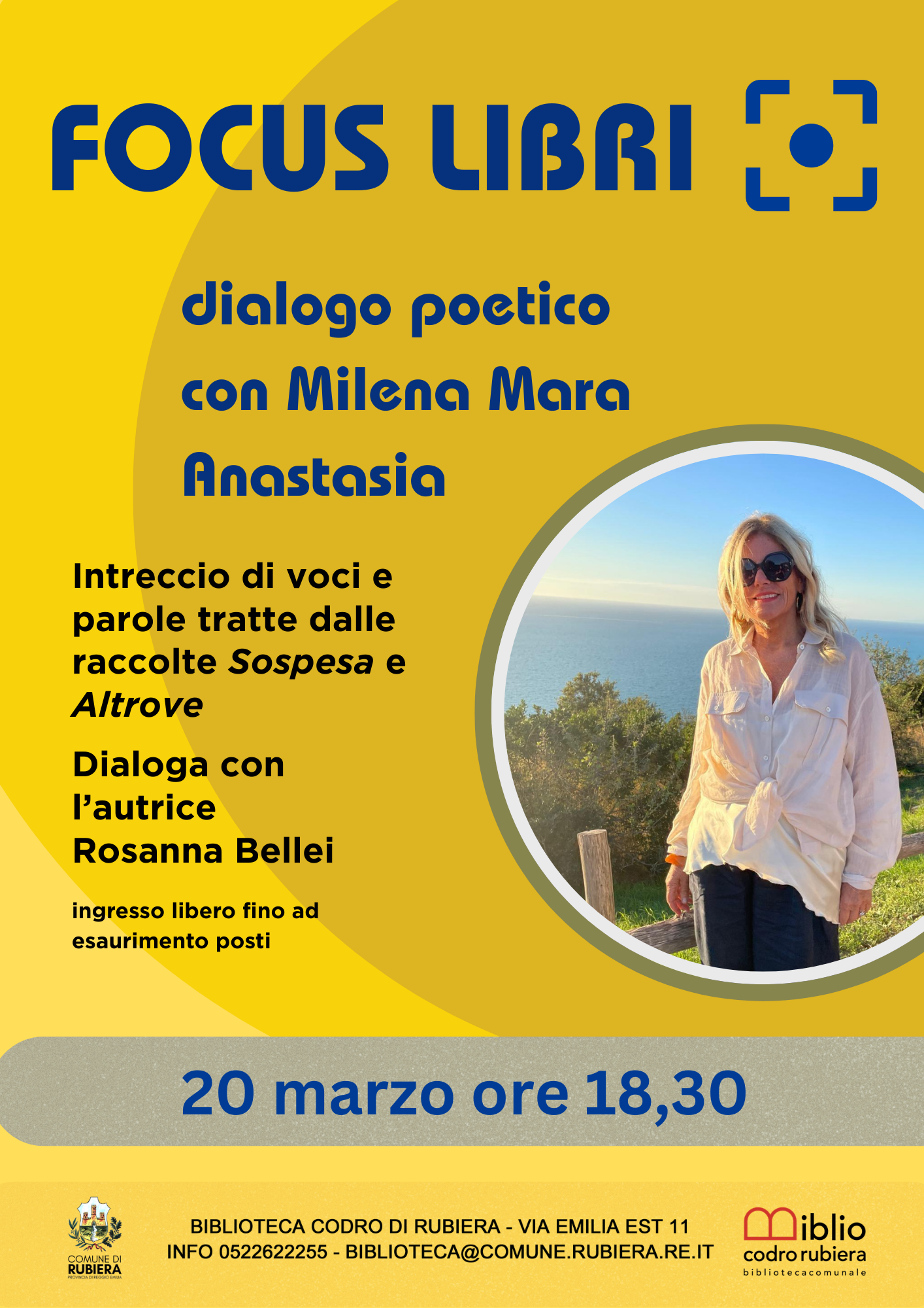 Il 20 marzo alle 18,30 la biblioteca ospita un dialogo poetico tra Rosanna Bellei e Milena Mara Anastasia, autrice di "Sospesa tra terra e cielo " e "Altrove i luoghi dell'Anima", raccolte di poesie.