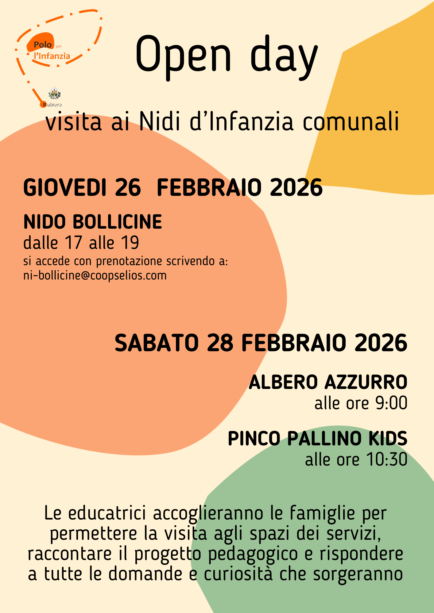 - nido Bollicine: giovedì 26 febbraio, dalle ore 17 alle 19, previa prenotazione scrivendo a: ni-bollicine@coopselios.com