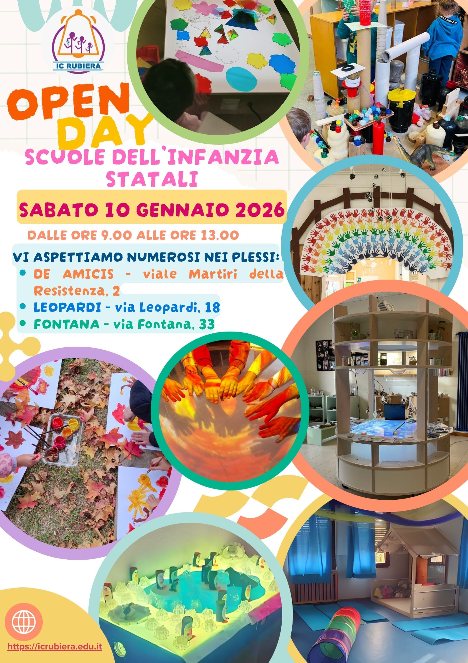 per le scuole De Amicis, Leopardi e Fontana sabato 10 gennaio 2026 dalle 9 alle 13 (Locandina Open Day scuole statali)